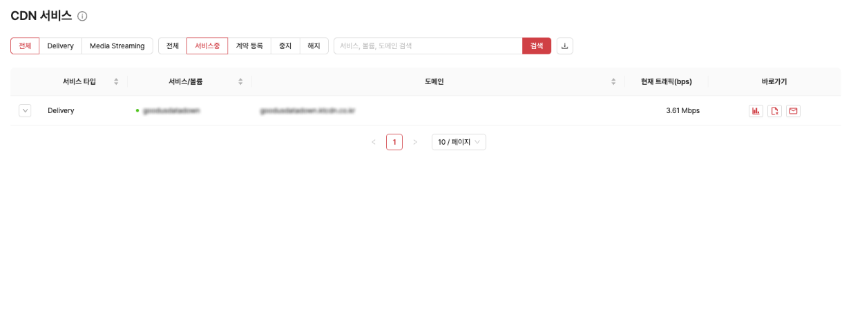 CDN 서비스 목록 입니다. 서비스 타입과 상태를 필터링 하여 조회 할 수 있습니다.